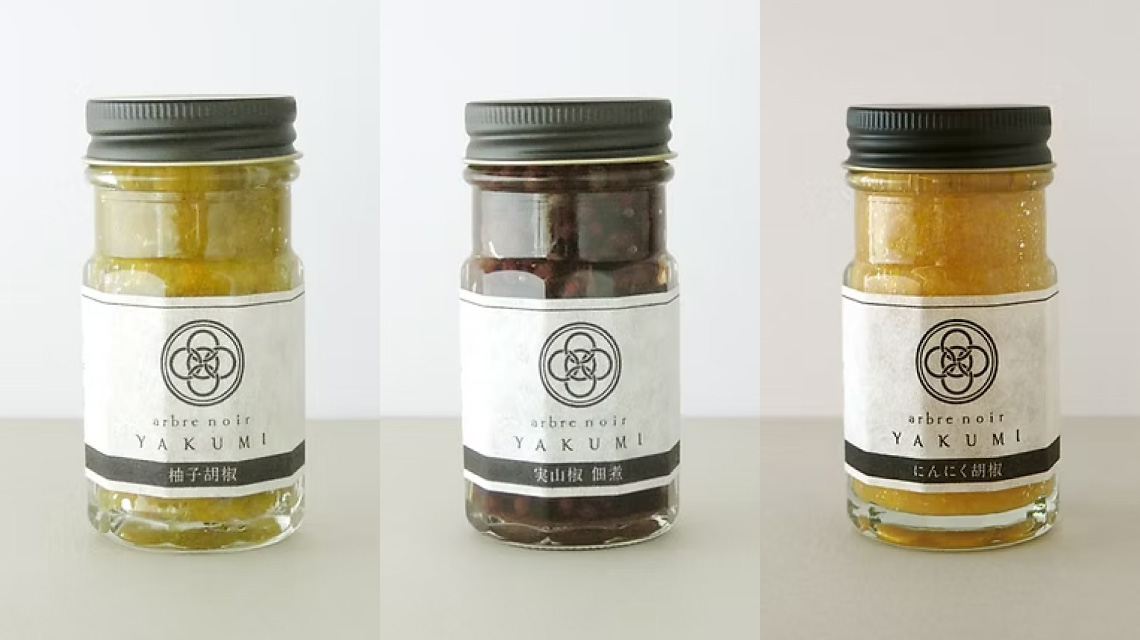 風味豊かな薬味の詰合わせです。(柚子胡椒、実山椒佃煮、にんにく胡椒)
